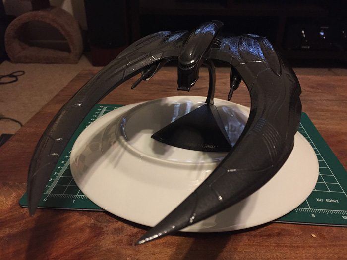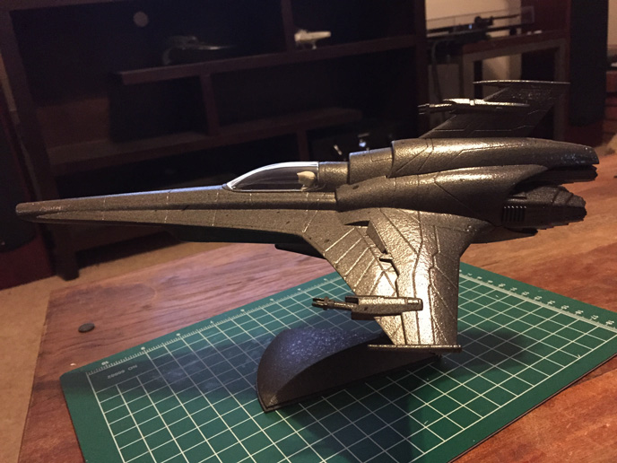 Here is an image of the Cylon Raider painted up. I took some liberties and made it dark gray/black with a bronze tint because i liked it more menacing like this.